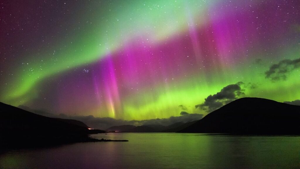 The Northern Lights Scotland are created by charged particles from the sun that collide with Earth’s magnetic field. It’s a type of solar storm that creates glowing streaks of light that ripple across the night sky. While they are most common near the Arctic Circle, strong geomagnetic activity extends its visibility to Scotland.